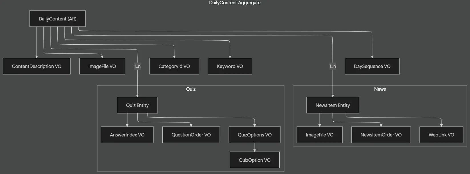- NewsItem/Quiz는 DailyContent 없이는 비즈니스적으로 의미가 거의 없다.