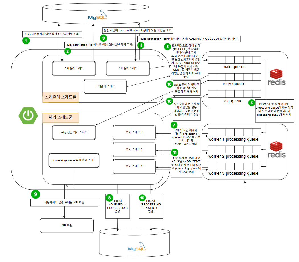 - 푸시 중간에 서버가 다운되면 보조 스케줄러가 돌면서 status='QUEUED'인데 10분이 지나도록 SENT로 바뀌지 않은 작업들을 찾아서 다시 큐에 푸시한다. (작업 유실 방지)